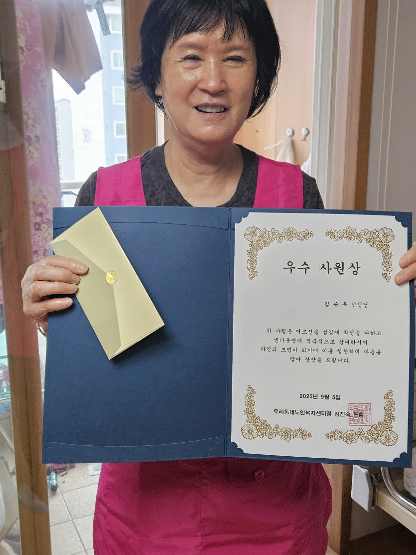 2025년 9월 우수사원은 5년동안 안성지역에서 송**어르신을 정성스럽게 섬겨주신 김순옥선생님, 1년을 별다른 말씀없이 최선을 다해 최** 어르신을 섬겨주신 정영진 선생님께 드립니다. 모두 축하해 주시길 바랍니다.