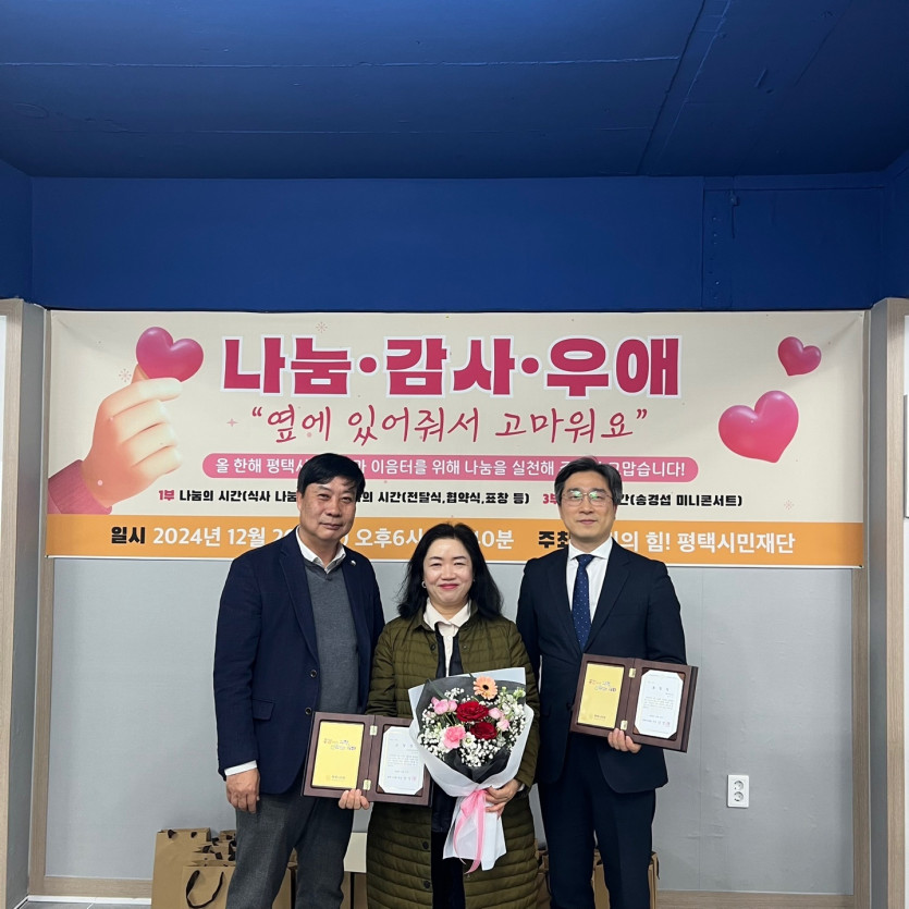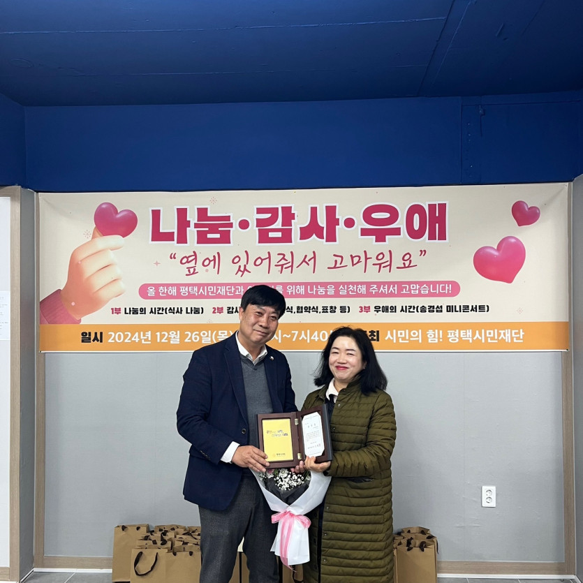 어제 제5회 더핫한겨울나기 후원후 평택시민재단에서 "나눔, 감사,우해"의 시간에 평택시의회의장상을 수상했습니다