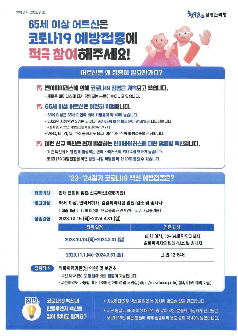 '23∼'24절기 코로나19 재유행을 대비한 예방접종이 65세 이상 어르신을 대상으로 2023.10.19.부터 시작됩니다.