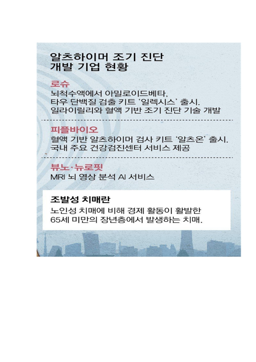 최근에는 간편하게 알츠하이머 조기 진단을 받을 수 있도록 뇌척수액, 혈액 기반의 진단 기술이 개발되고 있다. 글로벌 제약사인 로슈는 뇌척수액에서 알츠하이머의 원인으로 지목되고 있는 아밀로이드베타, 타우 단백질을 검출해내는 진단 키트 ‘일렉시스’를 출시했다. 2022년 미국 식품의약국(FDA)의 승인을 받고 2023년 국내 식품의약품안전처에서도 승인을 받았다. 아밀로이드 PET 검사 결과와 90% 이상 일치하는 등 높은 정확도를 보이지만, 허리의 척추 사이에 바늘을 꽂아 뇌척수액을 뽑아내는 ‘요추천자’ 시술을 해야 한다는 부담이 있다.로슈는 이런 단점을 보완하기 위해 또 다른 글로벌 제약사 일라이릴리와 함께 혈액 기반의 알츠하이머 진단 기술을 개발 중이다. 국내에서는 피플바이오가 혈액 기반 알츠하이머 검사 제품인 ‘알츠온’을 개발해 현재 KMI 한국의학연구소, 하나로의료재단 등 국내 대형 건강검진센터들에 서비스를 제공 중이다.고영호 국립보건연구원 뇌질환연구과 과장은 “최근에는 혈액 기반의 조기 진단 기술의 정확도가 매우 높아졌다는 연구 결과가 많이 나오고 있어 조기 진단의 대중화가 이뤄질 것으로 기대한다”고 했다. - 동아일보 발췌 -